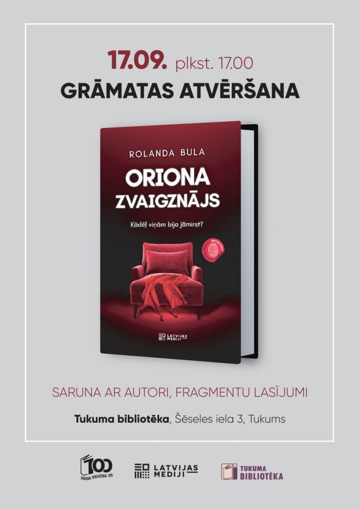 17. septembrī pl. 17.00 Tukuma bibliotēkā Rolandas Bulas jaunākais romāns “Oriona zvaigznājs”, sarunas ar autori un fragmentu lasījumi.