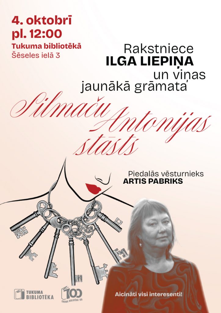 4. oktobrī pl. 12.00 aicinām uz tikšanos ar rakstnieci Ilgu Liepiņu. Saruna par viņas jaunāko grāmatu “Silmaču Antonijas stāsts“.